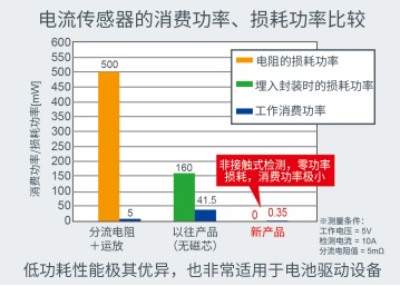 以往的產(chǎn)品,霍爾元件本身的消費電流就很大,因此當(dāng)作為電流傳感器產(chǎn)品使用時,會產(chǎn)生10mA左右的消費電流。而新產(chǎn)品利用MI元件的低消費電流特性,實現(xiàn)了超低工作消費電流0.07mA(5V工作時的消費功率0.35mW),與以往產(chǎn)品相比,消費電流僅為1/100。此外,相比以往6.0mm x 4.9mm的尺寸,新產(chǎn)品僅3.5mm見方,業(yè)界最小的消費電流加上超小尺寸,非常適用于電池驅(qū)動設(shè)備。