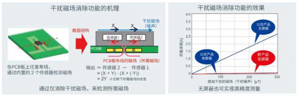 以往產(chǎn)品會因受地磁等干擾磁場的影響而產(chǎn)生測量誤差,需要采用磁屏蔽措施來屏蔽干擾。而ROHM的新產(chǎn)品,安裝在PCB板的往復(fù)布線上,利用內(nèi)部的雙感應(yīng)單元即可消除產(chǎn)生噪聲的干擾磁場,僅會檢測到原本需要測量的電流產(chǎn)生的磁場,因此無需屏蔽即可實現(xiàn)高精度測量。