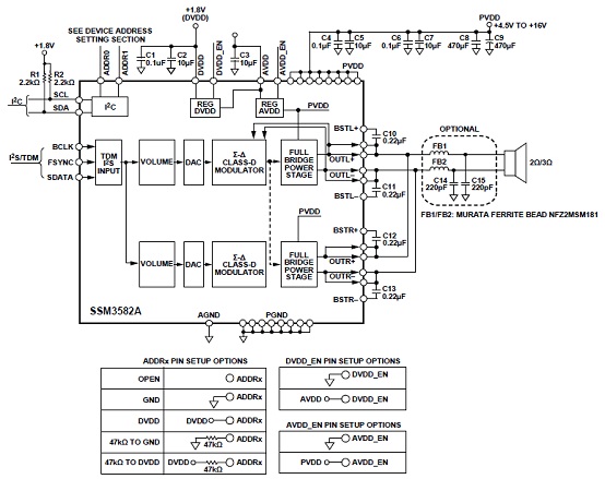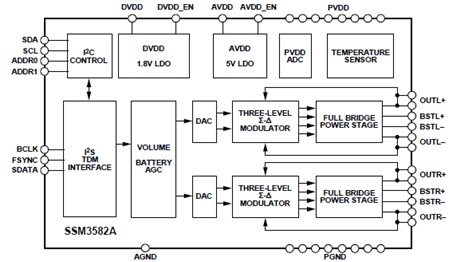 The SSM3582A is a fully integrated, high efficiency, digital input stereo Class-D audio amp