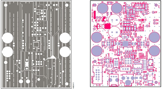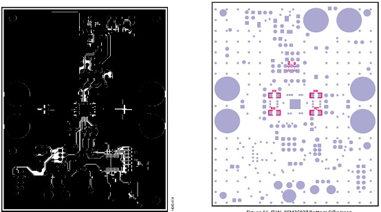 圖12.評估板EVAL-SSM3582Z PCB設(shè)計圖:左: 頂層,銅;右:第二層,銅