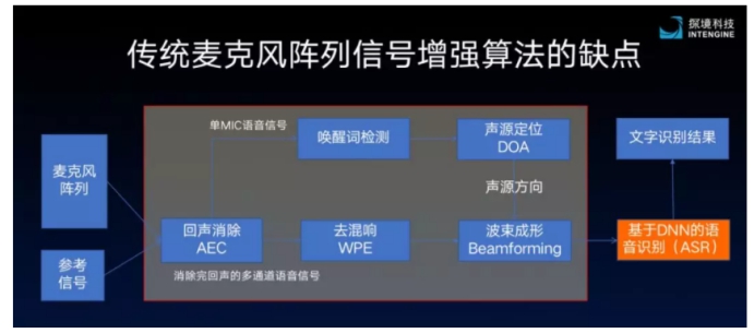 再者,傳統(tǒng)的流程對硬件要求非常高,對MIC的一致性以及電容元器件的一致性要求非常高。這就節(jié)能會導(dǎo)致大家在實(shí)驗(yàn)室和在量產(chǎn)線上取得不同的結(jié)果。量產(chǎn)場景下的識別率非常差。這主要與波束成形和聲源定位要求高,一旦出現(xiàn)波動會影響識別效果有關(guān)。