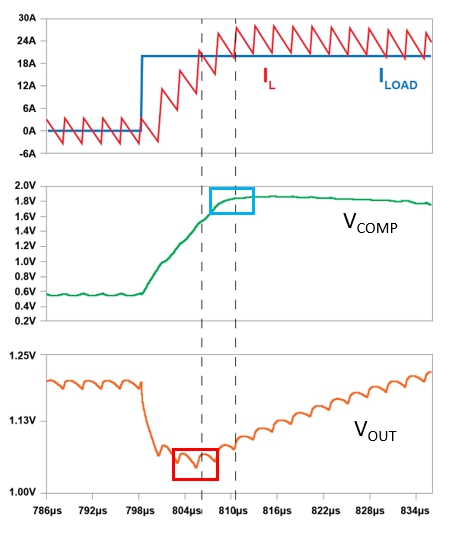 圖 2 顯示了誤差放大器延遲對環(huán)路瞬態(tài)響應(yīng)的影響。在這個示例中,負載電流從0A快速上升到20A,從底部曲線可以看到,VOUT在恢復(fù)之前出現(xiàn)了明顯的下降。綠色曲線為誤差放大器的輸出曲線,在最大下沖發(fā)生后的兩個周期內(nèi),它才達到最大值。此種延遲由誤差放大器的低通濾波器引起。