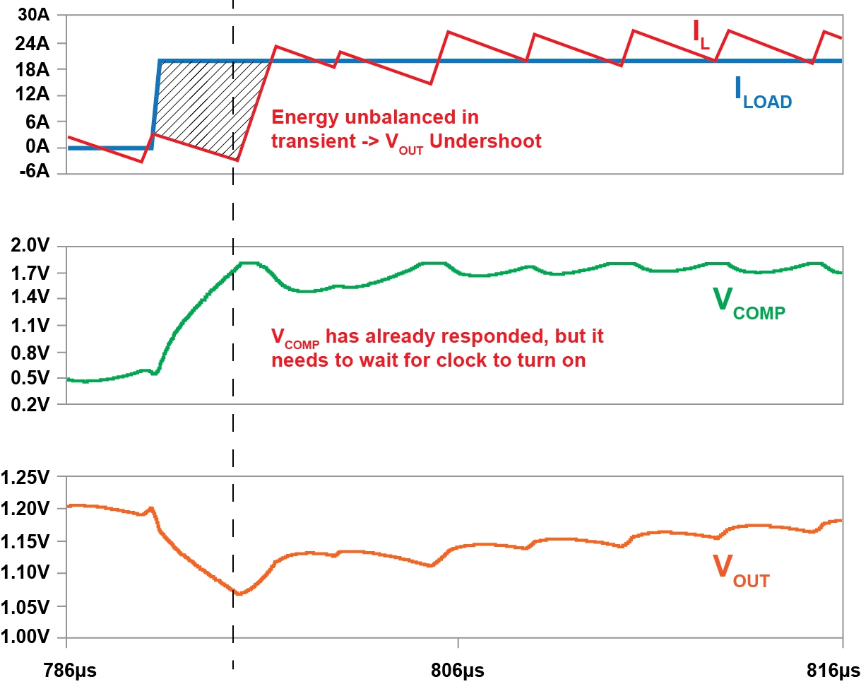 第二個因素為內(nèi)部時鐘引起的開關(guān)周期延遲,內(nèi)部時鐘將脈寬調(diào)制(PWM)控制反饋至輸出MOSFET。在連續(xù)電流控制工作模式下,由于其控制頻率是固定的,所以MOSFETs的導(dǎo)通時序由時鐘周期決定。即使采用PWM占空比控制上管MOSFET的導(dǎo)通時間,在下一個時鐘周期開始之前它 也無法再次導(dǎo)通。一旦上管MOSFET關(guān)斷,負載電流會從0A上升至20A(見圖3)。誤差放大器的輸出會快速上升來響應(yīng),但上管MOSFET必須 等到下一個時鐘周期才會打開。在這期間,輸出電壓持續(xù)下降。陰影區(qū)域為負載電流與電感電流的差值區(qū)域,這部分不足的電流必須由輸出電容提供并會引起輸出電壓下沖。