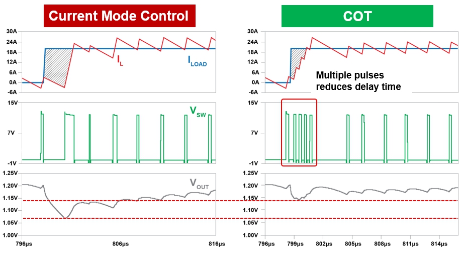 另外,COT控制的瞬態(tài)響應(yīng)時間比傳統(tǒng)的電壓或電流模式控制快兩倍。較低的下沖使它更容易滿足負載電壓公差規(guī)格。這也意味著,與電壓或電流模式變換器相比,基于COT控制模式的變換器需要更少的輸出電容便能滿足給定的負載瞬態(tài)響應(yīng),既節(jié)省了空間尺寸又節(jié)約了成本。