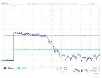 圖1是電流與時間的關(guān)系圖,顯示了刷式直流電機的啟動曲線。在此例中,在電機達到小于1安培的穩(wěn)態(tài)條件前,電流被限定為約2安培。如果沒有電流調(diào)節(jié),同樣的電機峰值可以達到14安培以上。因此不僅需要過度設(shè)計的電源來支持這一瞬態(tài),還需要對電機驅(qū)動器進行額定以可靠地處理峰值電流。