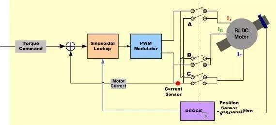 轉(zhuǎn)軸轉(zhuǎn)矩= 1.5I0*Kt(一個獨立于轉(zhuǎn)軸角度的常數(shù))正弦整流換向無刷電機控制器努力驅(qū)動三個電機繞組,其三路電流隨著電機轉(zhuǎn)動而平穩(wěn)的進(jìn)行正弦變化。選擇這些電流的相關(guān)相位,這樣它們將會產(chǎn)生平穩(wěn)的轉(zhuǎn)子電流空間矢量,方向是與轉(zhuǎn)子正交的方向,并具有不變量。這就消除了與北形轉(zhuǎn)向相關(guān)的轉(zhuǎn)矩紋波和轉(zhuǎn)向脈沖。