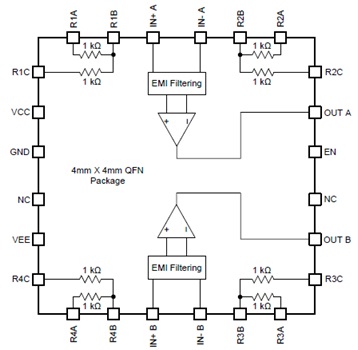 The INA1620 integrates a dual, bipolar-input, audio operational amplifier with four high-precision thin-film resistorpairs on the same die. The internal amplifiers and resistor pairs are pinned out to allow for many circuitconfigurations.
