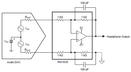 圖2.INA1620應(yīng)用電路:耳機放大器