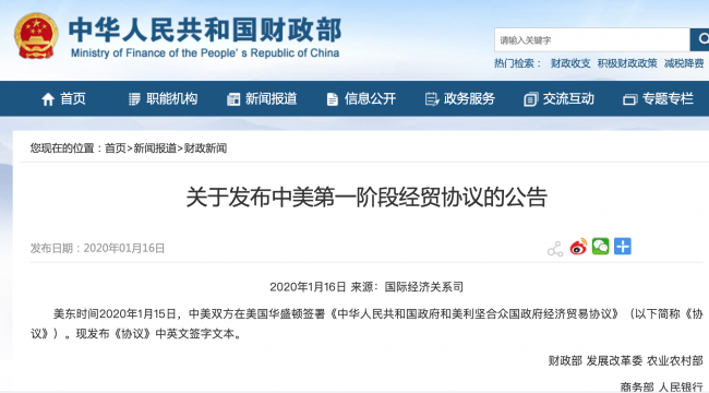 中美第一階段經(jīng)貿(mào)協(xié)議全文發(fā)布