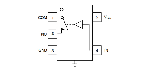 要在兩個(gè)音頻信號輸出之間切換音頻輸入信號,須將音頻輸入連接到兩個(gè) NS5B1G384 開關(guān)的 COM 引腳。將每個(gè)開關(guān)的 NC 引腳連接到其各自的變換器,例如耳機(jī)和揚(yáng)聲器。請注意,一次只能選擇一個(gè) IN 引腳。