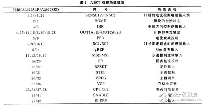 A3977有兩種封裝:一種是44引腳銅標(biāo)塑封(后綴為ED,A3977SED),另一種是28引腳帶散熱襯墊的塑封(后綴為L(zhǎng)P,A3977SLP),其引腳功能說(shuō)明如表1所示。