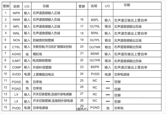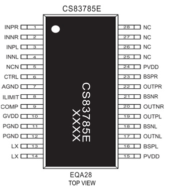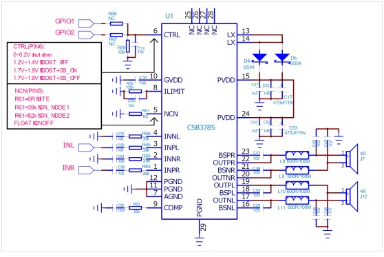 3.7V鋰電池供電依然是現(xiàn)階段便攜式音箱主流方式。在有限的電池電壓前提下為了把輸出功率做大,功放芯片內(nèi)置升壓模塊把升壓值再提高。此時,要考慮到效率問題,理論上升壓越高,壓差越大,效率越低。CS83785是一款內(nèi)置升壓音頻功放IC,3.7V鋰電池供電內(nèi)置升壓到8.5V,能提供2×10W持續(xù)功率輸出。效率最高達(dá)85%,這就保證了輸出功率恒定以及整機(jī)溫升在正常范圍之內(nèi),以及鋰電池的續(xù)航時間。CS83785另一個亮點是可以支持外接12V電源直供,此時能提供2×18W輸出功率。還有其他豐富的功能以及性能:兩種防破音可選、擴(kuò)頻模式、過流保護(hù)、短路保護(hù)、過熱保護(hù)等。采用簡潔的EQA28封裝設(shè)計生產(chǎn)也非常方便。