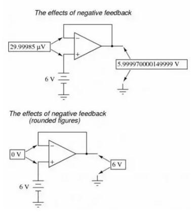 然后,這個電路很快就會達(dá)到一個穩(wěn)定狀態(tài),輸出電壓的幅值會很準(zhǔn)確的維持運(yùn)放兩個輸入端之間的壓差,這個壓差 Ve 反過來會產(chǎn)生準(zhǔn)確的運(yùn)放輸出電壓的幅值。將運(yùn)放的輸出與運(yùn)放的反相輸入端連接起來,這樣的方式被稱為負(fù)反饋,這是使系統(tǒng)達(dá)到自穩(wěn)定的關(guān)鍵。這不僅僅適用于運(yùn)放,同樣適用于任何常見的動態(tài)系統(tǒng)。這種穩(wěn)定使得運(yùn)放具備工作在線性模式的能力,而不是僅僅處于飽和的狀態(tài),全“開”或者全“關(guān)”,就像它被用于沒有任何負(fù)反饋的比較器一樣。