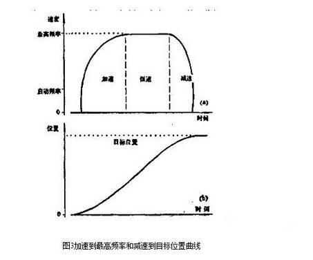 因為步進電機系統(tǒng)的啟動頻率比它的最高運行頻率低得多,因此,為了減少定位時間,常常通過加速使電機在接近最高的速度下運行。隨著目標位置的逼近,為使電機平穩(wěn)地停下來,重新使步進頻率逐漸降低到啟停電機頻率。從初始位置往目標位置運動的整個過程中,步進頻率都在變。若以曲線表示即得“速度曲線”,如圖3所示。注意;減速可以比加速快得多,因為負載轉(zhuǎn)矩幫助系統(tǒng)制動;而且,電機產(chǎn)生的減速轉(zhuǎn)矩比 (a)速度曲線;(b)對應的位置/時間響應曲線加速轉(zhuǎn)矩大。