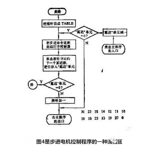 在這個實例中,電機的步數(shù)是固定的,步進命令之間的時間受從“TABLE”單元開始的查閱表里存儲數(shù)值的控制。程序以設(shè)寄存器“指針”等于“TABLE”開始,因此,“指針”里裝有查閱表中第一個值的地址。然后,把第一次步進命令發(fā)給激磁時序控制器,用它改變電機里的相激磁。