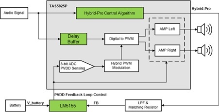 TAS5825P為德州儀器2019年新推出的數(shù)字輸入D類功放芯片。該芯片內(nèi)置強(qiáng)大的音頻 DSP 內(nèi)核,實(shí)現(xiàn)了一種稱為 Hybrid-Pro 的專有算法。Hybrid-Pro算法可檢測即將發(fā)生的音頻功率需求,并通過反饋引腳 (HPFB) 為DC/DC變換器提供 PWM 控制信號來調(diào)整輸出電壓(即D類功放的電源電壓 PVDD)。TAS5825P支持高達(dá) 4ms 的延遲緩沖器 (Delay Buffer),以提前查看音頻信號并防止音頻削波失真。