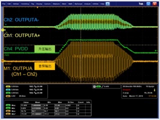 圖7. TAS5825P 實(shí)現(xiàn)實(shí)現(xiàn)動(dòng)態(tài)調(diào)壓音頻功放的實(shí)驗(yàn)波形