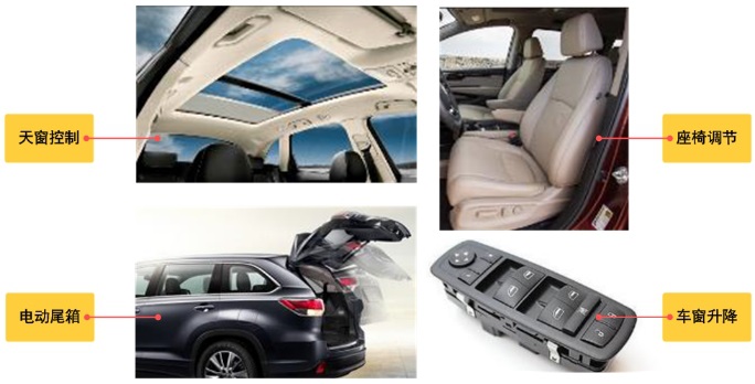 電機(jī)在汽車上的應(yīng)用,讓汽車實現(xiàn)自動化,加強(qiáng)駕駛安全性以及舒適性。不同類型的電機(jī)因各自的特點而被應(yīng)用到汽車上不同的功能模塊,有刷直流電機(jī)同樣也在汽車的多個功能模塊中用到,如下圖所示。