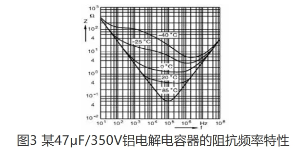由圖可知,隨著頻率的升高,容抗下降、感抗上升,容抗等于感抗并相互抵消時(shí)的頻率為鋁電解電容器的諧振頻率,這時(shí)的阻抗最低,僅剩下ESR。如果ESR為零,則這時(shí)的阻抗也為零;頻率繼續(xù)上升,感抗開始大于容抗,當(dāng)感抗接近于ESR時(shí),阻抗頻率特性開始上升,呈感性,從這個(gè)頻率開始以上的頻率下電容器時(shí)間上就是一個(gè)電感。由于制造工藝的原因,電容量越大,寄生電感也越大,諧振頻率也越低,電容器呈感性的頻率也越低。這就要求它在開關(guān)穩(wěn)壓電源的工作頻段內(nèi)要有低的等效阻抗,同時(shí),對(duì)于電源內(nèi)部,由于半導(dǎo)體器件開始工作所產(chǎn)生高達(dá)數(shù)百千赫的尖峰噪聲,亦能有良好的濾波作用,一般低頻用普通電解電容器在10kHz左右,其阻抗便開始呈現(xiàn)感性,無(wú)法滿足開關(guān)電源使用要求。