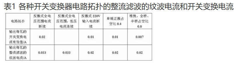 影響電解電容器性能的最主要的參數(shù)之一就是紋波電流問(wèn)題。紋波電流對(duì)鋁電解電容器的影響主要是在ESR上產(chǎn)生功耗使鋁電解電容器發(fā)熱,進(jìn)而縮短使用壽命。 從特性曲線中(圖2)可以看到,紋波電流在ESR上產(chǎn)生的損耗與紋波電流有效值的平方成正比,因而隨著紋波電流的增加,小時(shí)壽命曲線類似于拋物線函數(shù)曲線。降低紋波電流的方法可以采用較大容量的鋁電解電容器,畢竟大容量鋁電解電容器可承受的紋波電流比小容量的鋁電解電容器大;也可以采用多只小容量鋁電解電容器的并聯(lián)方式,還可以選用紋波電流低的電路拓?fù)浣Y(jié)構(gòu)。一般而言,反激式變換器產(chǎn)生的開關(guān)變換電流相對(duì)最大。表1是各種開關(guān)變換器電路拓?fù)涞闹绷麟娏、整流濾波的紋波電流、開關(guān)變換電流和濾波電容上的總紋波電流。