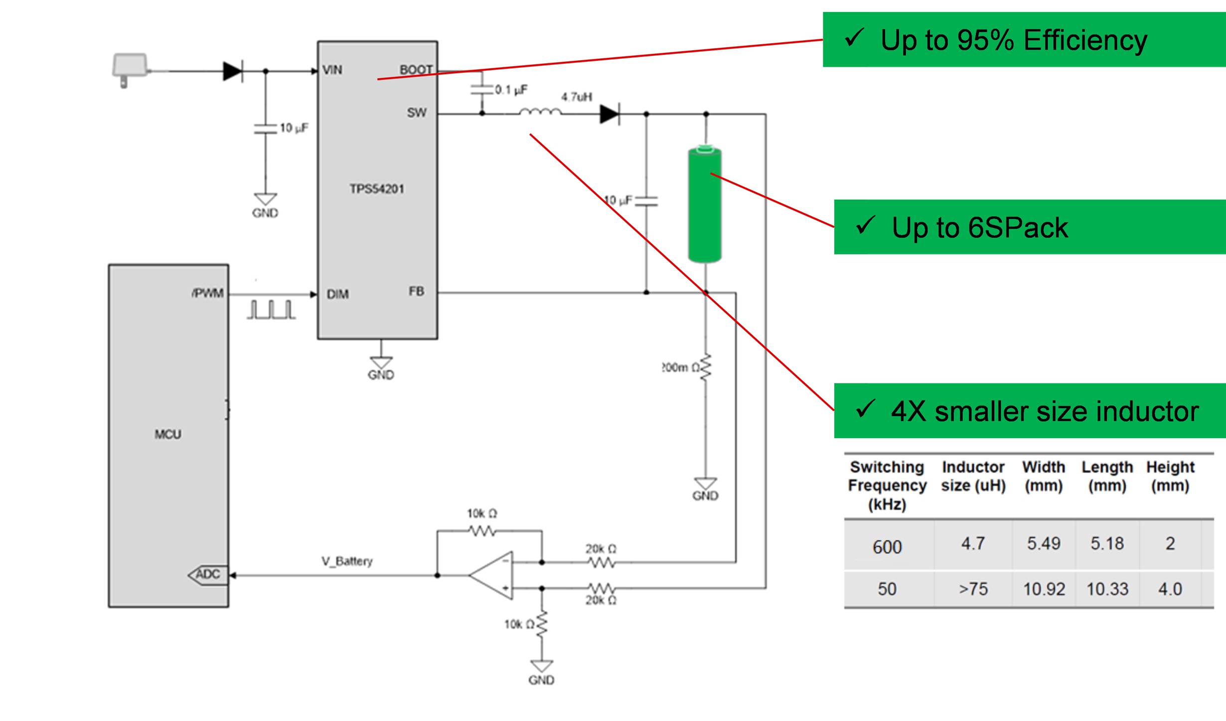 TPS54201 是一款輸入電壓范圍為 4.5V 至 28V 的 1.5A 恒流驅動器,通過控制PWM 引腳調節(jié)電流。在SOT23-6封裝內集成 150mΩ 和 70mΩ MOSFET,可實現(xiàn)高達95%的轉換效率。如圖2 所示,通過MCU采樣電池電壓,輸出PWM控制TPS54201的充電電流,僅需4.7uH電感和極少的外圍元件就可以組成一個完整的鋰電池充電管理方案。 充電電流可達1.5A,支持1~6節(jié)鋰離子電池,同時也支持磷酸鐵鋰電池。與分立方案相比,TPS54201充電方案不再需要電平轉換電路,電流采樣電路,MOS管和整流二極管,同時集成了過流短路保護功能。