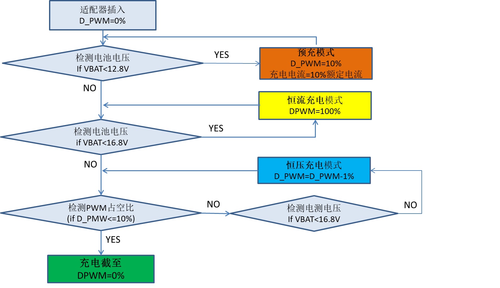 為了更好的保護鋰電池,一般要求充電過程按涓流充電(低壓預充)、恒流充電、恒壓充電以及充電截至四個階段。圖3是TPS54201的充電管理流程圖,以四節(jié)鋰電池為例,當適配器插入后,初始的PWM占空比D_PWM=0,當MCU 檢測到電池電壓小于12.8V, 設定D_PWM=10%, 進入預充階段,此時的充電電流是額定電流的10%。當電池電壓上升并達到12.8V后,設定D_PWM=100%,進入恒流充電階段,充電電流上升至額定電流。隨著充電電壓上升并達到額定電壓16.8V時,進入恒壓充電階段,以1%為步長(step),逐步減少D_PWM,保持電池電壓接近額定電壓16.8V。最后D_PWM減少至10%時,充電電流等于截至電流(通常為10%的額定充電電流),設定D_PWM=0%, 充電截至。