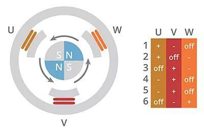 因?yàn)?BLDC 電機(jī)的轉(zhuǎn)子受旋轉(zhuǎn)的定子磁極影響,所以須追蹤定子磁極位置,以有效驅(qū)動(dòng)三個(gè)電機(jī)相。為此,需使用電機(jī)控制器在三個(gè)電機(jī)相上生成六步換向模式。這六步(或換向相)移動(dòng)電磁場(chǎng),進(jìn)而使轉(zhuǎn)子永磁體移動(dòng)電機(jī)軸。