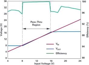 常見的 DC-DC 轉換器問題是:在輸入電壓可能高于、低于或等于輸出時生成穩(wěn)壓電壓,也就是說,轉換器必須執(zhí)行升壓和降壓操作。從標稱 12 V 電池為汽車電子供電,就是一個典型場景,從引擎冷啟動(低至 3 V)到負載突降(高達 100 V),或者因為操作員出錯導致出現反向電池電壓(電壓變化范圍相當廣泛)。從 SEPIC 到 4 開關拓撲,有好幾種 DC-DC 轉換器拓撲可以執(zhí)行升壓和降壓操作,但這些解決方案中沒有任何一個能夠在主動激活開關的情況,直接將輸入電壓輸入到輸出,現在依然是這樣。