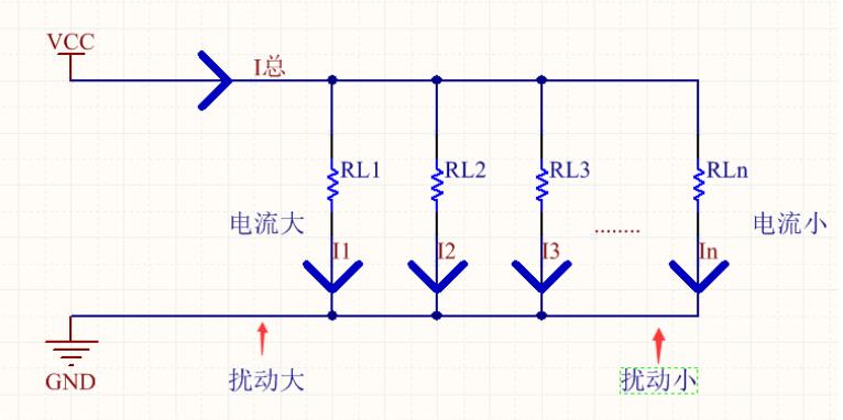 所以,要求嵌入式板卡的電源以及地需要設(shè)計(jì)合理,如上圖所示,電源輸入總電流為I總,分別流向負(fù)載,RL1、RL2….RLn,均會產(chǎn)生一個(gè)對應(yīng)的電流I1,I2……In。