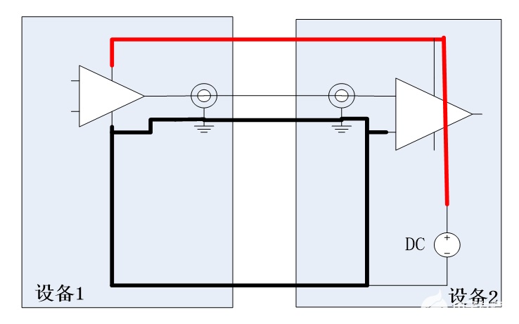 如上圖,設(shè)備一和設(shè)備2都有自己的獨(dú)立供電系統(tǒng),本來Device1和Device之間只有屏蔽線互相接GND,但是因?yàn)槎冀拥搅?20V電源,所有又構(gòu)成了如上圖紅色的地環(huán)路。