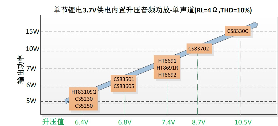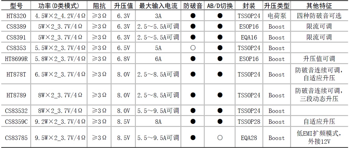 恒定4.8W/2.5V-5.5V(內(nèi)置自適應(yīng)Charge Pump模塊)/4Ω |