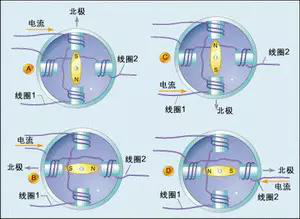 接著,我們再將繞組2的電流切斷,按照圖2c的方向給繞組1輸送電流,注意:這時繞組1中的電流流向與圖2a所示方向相反。于是定子的磁場北極就會指向下,從而導致轉(zhuǎn)子旋轉(zhuǎn),其南極也指向下方。