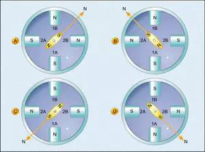 再假設(shè)我們切斷繞組1中的電流,而按圖2b所示方向給繞組2輸送電流,那么定子的磁場就會指向左側(cè),而轉(zhuǎn)子也會隨之旋轉(zhuǎn),與定子磁場方向保持一致。