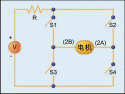 H橋通過一個電阻連接到一個電壓固定的直流電源(其幅度可根據(jù)電機的要求選取),然后,該電路再經(jīng)過4個開關(guān)(分別標為S1、S2、S3和S4)連接到繞組的兩根抽頭。這一電路的分布看起來有點象一個大寫字母H,因此叫做H橋。