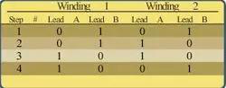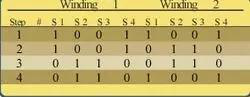 首先,要給腳1B和2B施加一個正電壓,并將1A和2A接地。然后,給腳1B和2A施加一個正電壓,而將1A和2B接地,這一過程其實取決于導線繞齒槽纏繞的方向,假設(shè)導線纏繞的方向與上一節(jié)所述相符。依次進行下去,我們就得到了表1中總結(jié)的激勵順序,其中,“1”表示正電壓,“0”表示接地。
