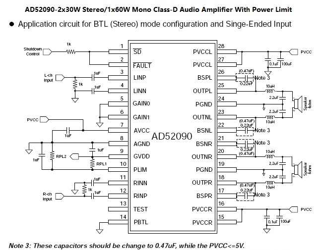 | AD52090 2x30W立體聲/60W單聲道D類功放IC |
