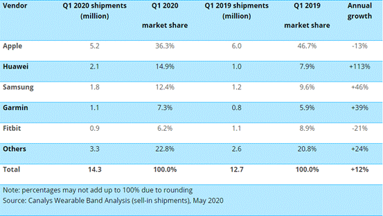 Canalys智能手表市場(chǎng)脈搏: Q1 2020
