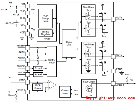 Using the external voltage reference pin, VREF,these devices can regulate the motor current duringstart-up and high-load events without interaction froma microcontroller.A low-power sleep mode achieves ultra-low quiescentcurrent draw by shutting down most of the internalcircuitry. Internal protection features include supplyundervoltage lockout, charge pump undervoltage,output overcurrent, and device overtemperature.Fault conditions are indicated on nFAULT.