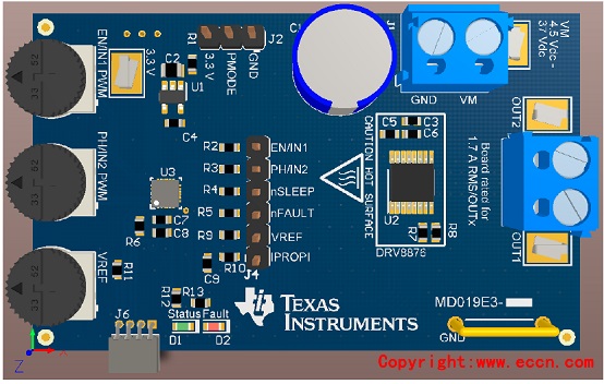 圖4.評估模塊DRV8876x/74xEVM PCB裝配面3D圖
