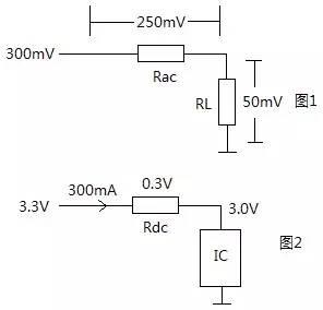 ③IC要求電源電壓最低不得低于3.0V,則磁珠上直流電阻Rdc上的最大壓降須不大于0.3V,如(圖2),即300mA * Rdc < 0.3 V,得Rdc < 1 Ω。
