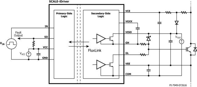 該公司的SID11x2K系列以標(biāo)準(zhǔn)eSOP封裝的單通道IGBT和MOSFET驅(qū)動器為代表。該系列采用固體絕緣體FluxLink技術(shù)提供增強(qiáng)型電氣隔離。其8 A峰值輸出電流能夠驅(qū)動高達(dá)600 A(典型值)的設(shè)備,而無需任何其他有源組件。