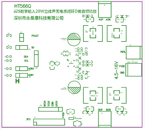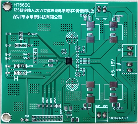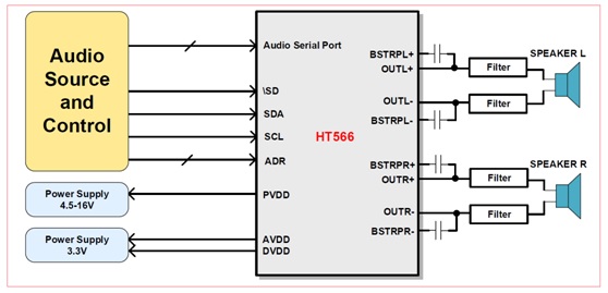 HT566 2x20W立體聲I2S數(shù)字輸入無電感閉環(huán)D類音頻功放解決方案