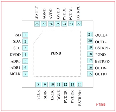 HT566 2×20W (VDD=14.5V, RL=4Ω, THD+N=1%) QFN-28 4.5V-16V I2S數(shù)字輸入20W立體聲無電感閉環(huán)D類音頻功放IC
