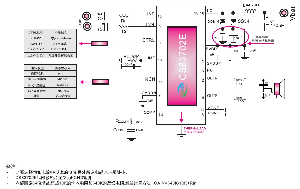 CS83702E的全差分架構(gòu)和極高的PSRR有效地提高對RF噪聲的抑制能力。無需濾波器的PWM調(diào)制結(jié)構(gòu)及內(nèi)置的BOOST升壓模塊 ,以及CS83702E采用專有的AERC((Adaptive Edge Rate Control)技術(shù),在音頻全帶寬范圍內(nèi)極大地降低了EMI的干擾,對60cm的音頻線 ,在FCC的標(biāo)準(zhǔn)下具有超過20dB的裕量,另外CS83702E內(nèi)置了過流保護(hù),短路保護(hù)和過熱 保護(hù),有效的保護(hù)芯片在異常的工作條件下不被損壞。