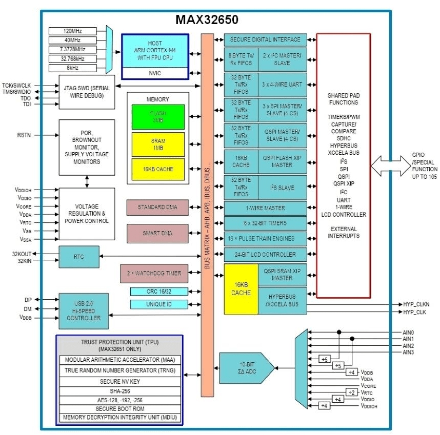 圖 3:Maxim Integrated 的 MAX32650 基于 120 MHz Arm Cortex-M4F,具有面向高性能物聯(lián)網(wǎng)邊緣計算應(yīng)用的全系列外設(shè)和存儲器選項。(圖片來源:Maxim Integrated)