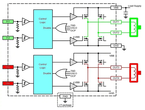 圖 4:Allegro MicroSystems 的 A3909 是雙 H 橋驅(qū)動器,可為步進電機線圈提供高達 1 A 的拉出和灌入電流。