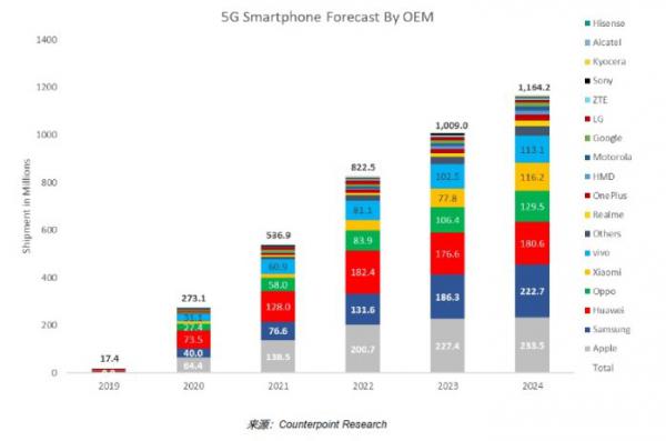 圖1:各廠商5G智能手機出貨量預測(來源:Counterpoint Research)