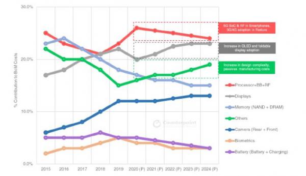 圖2:各組件在手機BoM總成本中的占比(來源:Counterpoint Research)