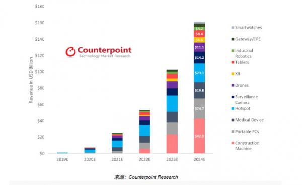 · 在2020年的國際消費電子技術展上,主要廠商紛紛展示了支持5G連網的筆記本電腦。這一細分市場預計將在2024年帶來約247億美元的收入。而5G智能手表和平板電腦預計將在2024年分別帶來20億美元和80億美元的收入。隨著5G SA部署的深入,無人機和XR預計將在2024年分別帶來110億美元和70億美元的收入。