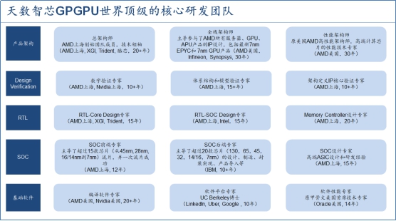 天數(shù)智芯就是這樣一家公司。天數(shù)智芯的芯片研發(fā)團隊于2018年初組建,數(shù)十名創(chuàng)始團隊主要來自世界知名芯片公司AMD的GPU部門和企業(yè)軟件翹楚Oracle、IBM、英偉達等公司。完整的芯片設(shè)計團隊在芯片設(shè)計領(lǐng)域平均積累了近十年經(jīng)驗,可以說,這是一支在世界范圍內(nèi)都不可多得的、完善的高端芯片設(shè)計隊伍。